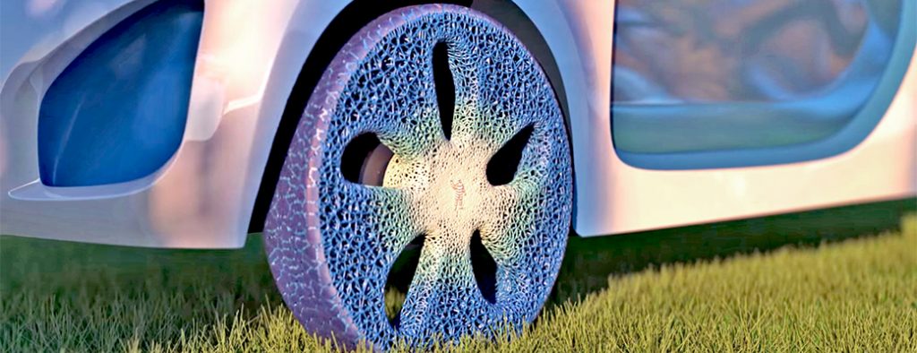 The Vision tire’s alveolar structure is inspired by both human and natural biology. The process of breathing is facilitated by the pulmonary system, which includes alveoli: small air pockets in the lungs that permit the exchange of oxygen and carbon dioxide.To be alveolar is to contain alveoli, as opposed to the conventional tire, which can be understood as a single, doughnut-shaped air pocket. Visually, the tire recalls the microscopic structure of human bone and coral (the latter of which has been specially developed as a proxy for the former).